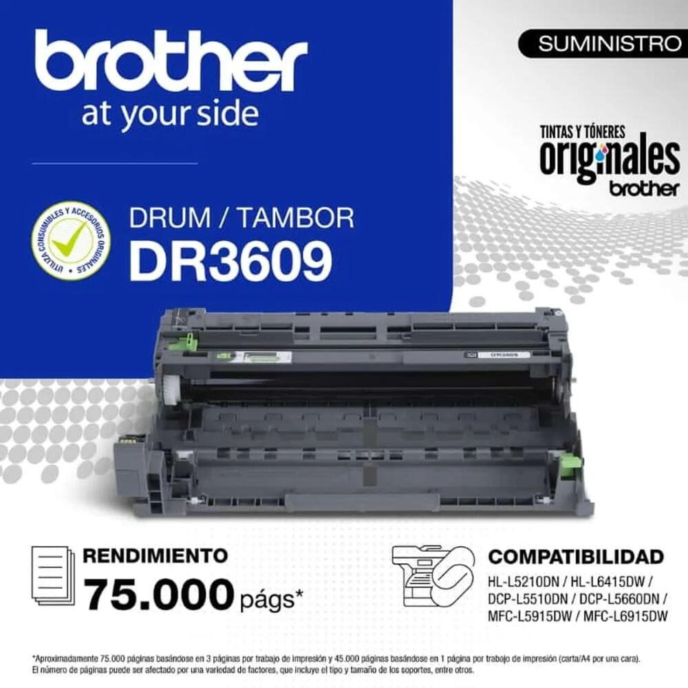 Maximiza el rendimiento de tu impresora con el Tambor Drum DR3609 de Brother, diseñado para ofrecer una impresión de alta calidad y durabilidad. Con una capacidad de hasta 75.000 páginas, este tambor garantiza impresiones nítidas y profesionales en cada uso, optimizando la eficiencia de tu equipo.