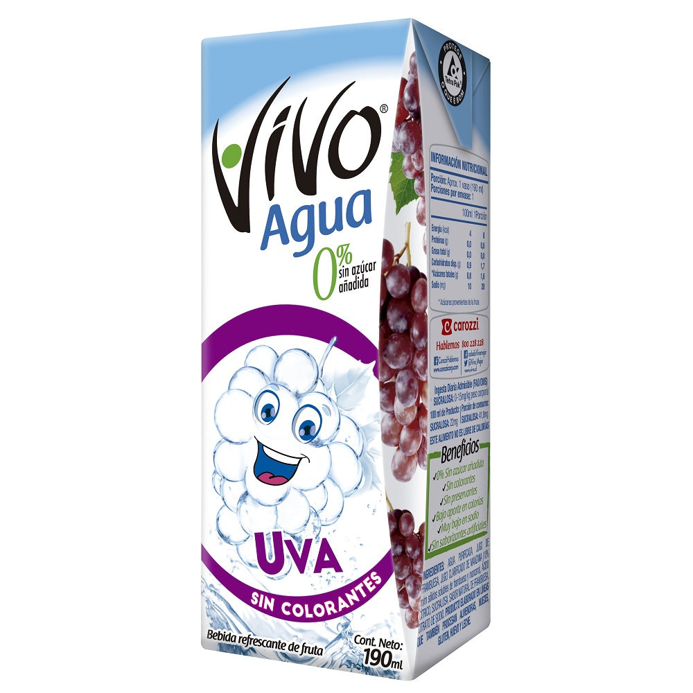 Agua con jugo de uva 190 ml Vivo, disfruta de un delicioso refresco sin azúcar añadida, colorantes y saborizantes artificiales. Puedes llevarlo a donde quieras con su formato de 190 ml.