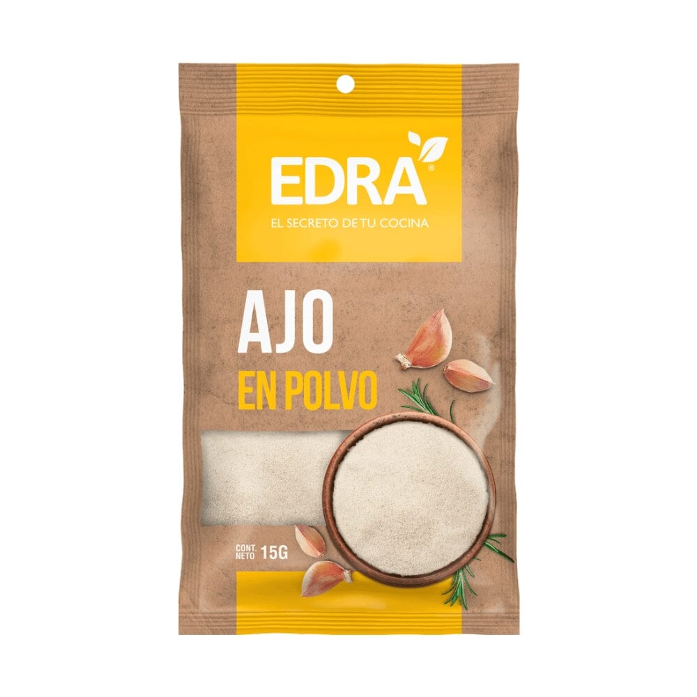 Dale un toque de sabor intenso y natural a tus comidas con el Ajo en Polvo Edra. Práctico, versátil y fácil de usar, es ideal para sazonar carnes, sopas, salsas y todo tipo de preparaciones. En su presentación en sobre de 15 gramos, es perfecto para tener siempre a mano en tu cocina.