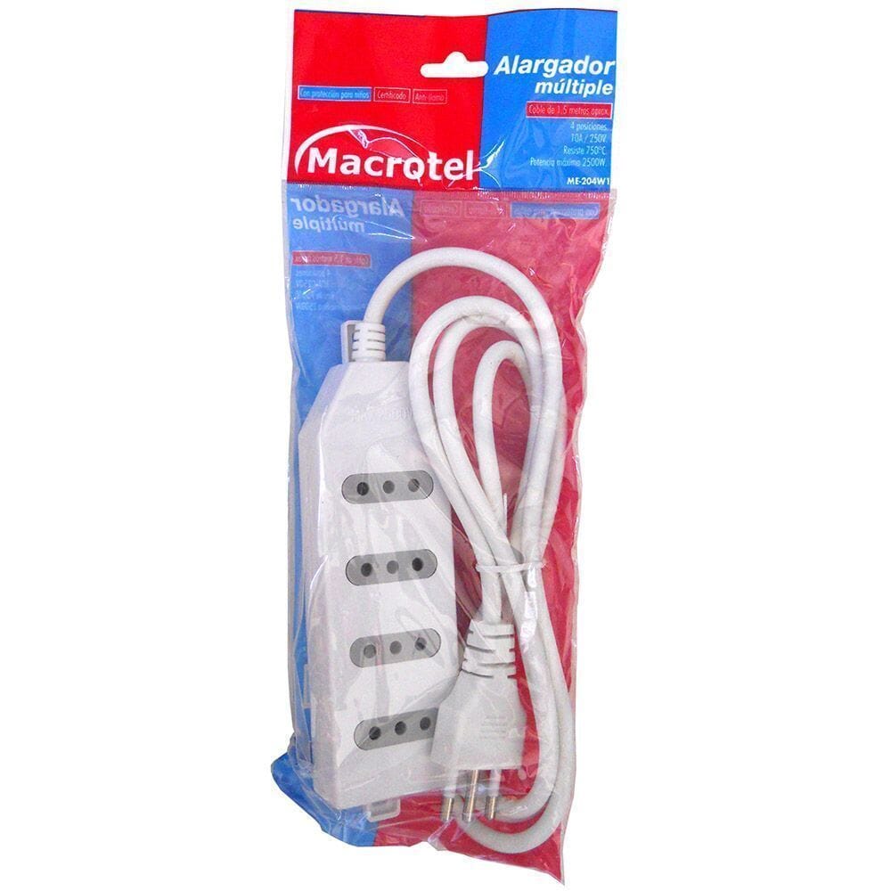 Conoce el Alargador Eléctrico MacroTel de 4 Posiciones en Color Blanco. Con una impresionante longitud de 3 metros, este alargador es la solución ideal para mantener tus dispositivos conectados donde más los necesitas.