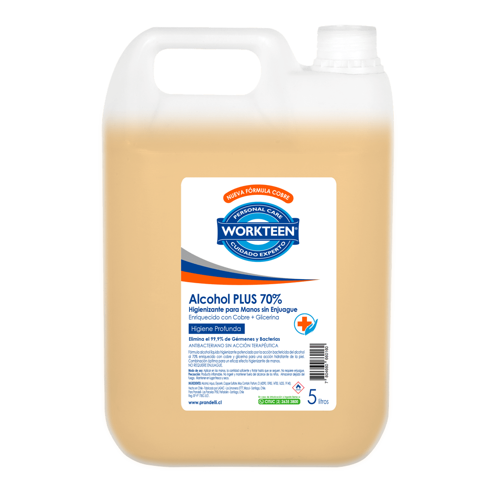 Alcohol Gel Con Cobre 5 Lt de Workteen: Protege tus manos con Alcohol Plus 70%, cobre y glicerina. ¡Higiene y cuidado en cada gota!