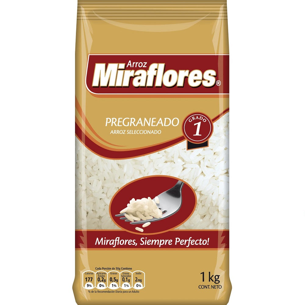 Conveniente paquete de arroz pre graneado grado 1 Laminado 1 Kg de Miraflores, perfecto acompañamiento a tus platillos con este delicioso complemento.