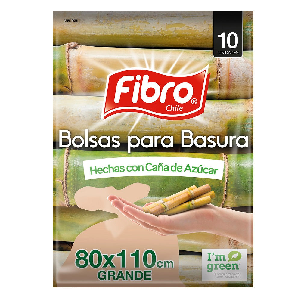 Bolsa de basura Fibro, ecológicas, fabricadas con PE proveniente de la caña de azúcar. Tamaño 80x1100 cm, grande. Cantidad: 10 Unidades.