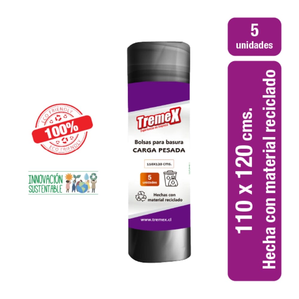 Las bolsas de basura Tremex son fabricadas con material reciclado y cuentan con certificación Global Recycled Standard 4.0 (GRS 4.0). Gracias a sus características de fabricación estas bolsas cumplen con todos los requisitos para un correcto uso a todo nivel. Sus diferentes medidas se ajustan a todas las necesidades desde uso doméstico hasta uso institucional. Las bolsas son 100% reciclables.