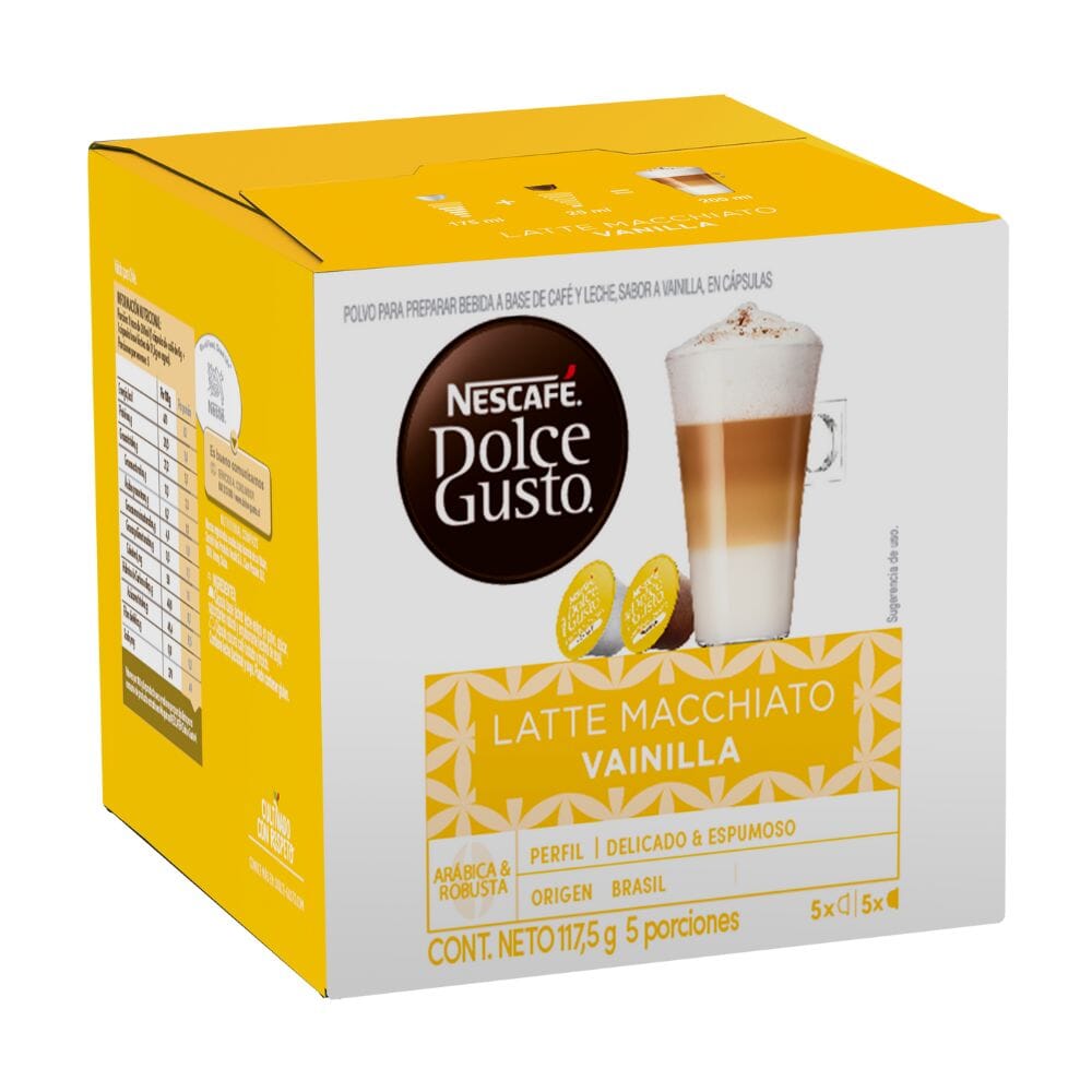 Cápsulas para cafeteras Nescafé Dolce Gusto. El conocido Latte Macchiato de siempre, con su leche cremosa y café 100% arábica pero con un delicioso sabor a vainilla.