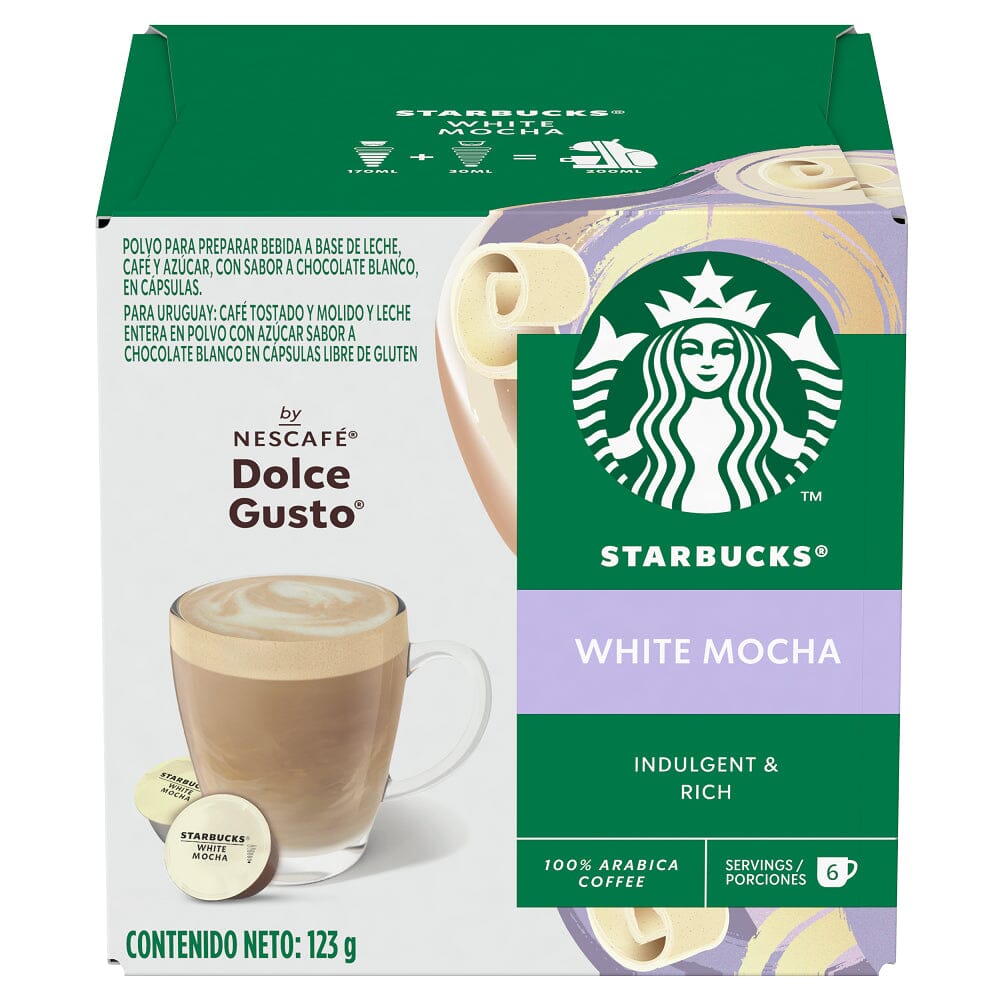 Las cápsulas Starbucks® White Mocha by NESCAFÉ® Dolce Gusto® ofrecen una experiencia indulgente que combina café 100% arábica de alta calidad con el delicioso sabor a chocolate blanco.