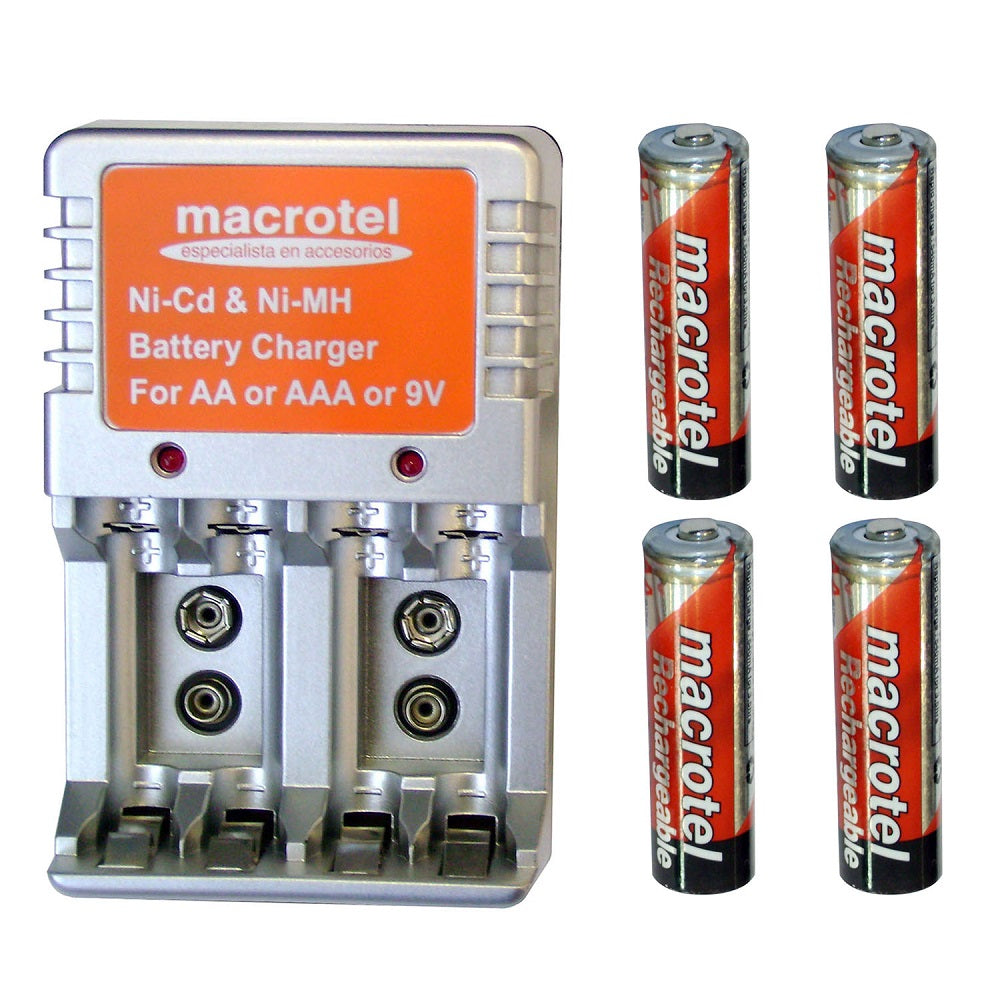 Carga: Independiente de 1 a 4 pilas AA ó pilas AAA, Ni-MH ó Ni-Cd y 1 ó 2 baterías 9V recargables.