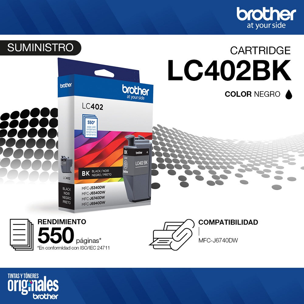 Cuando necesites tinta para tu impresora MFC-J6749DW de Brother, tenemos el cartucho de tinta lc402bks negro.Con el tienes hasta 550 páginas sin problemas de un tono negro. Será tu mejor compañero de trabajo.