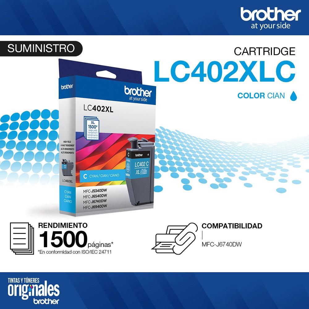Si necesitas tinta para tu impresora MFC-J6749DW de Brother, tenemos el cartucho de tinta lc402xcs cian/cyan.Con el tienes hasta 1500 páginas sin problemas de un tono cyan. Será tu mejor compañero de trabajo.
