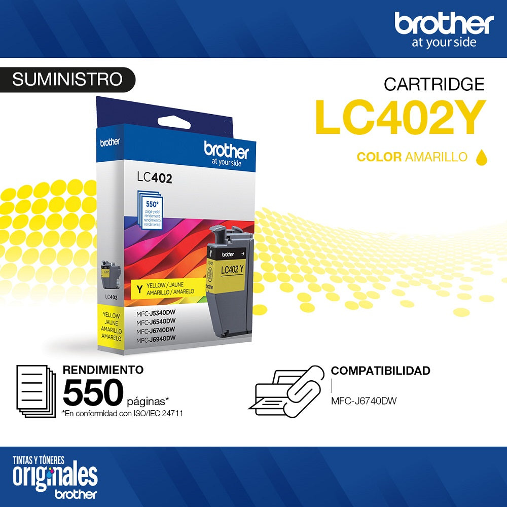 Cuando necesites tinta para tu impresora MFC-J6749DW de Brother, tenemos el cartucho de tinta lc402ys amarillo. Con el tienes hasta 550 páginas sin problemas de un tono amarillo. Será tu mejor compañero de trabajo.