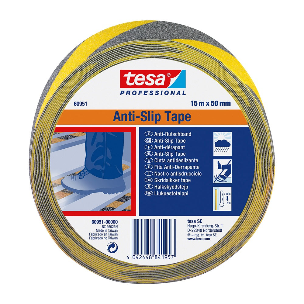 El área de aplicación para la gama de cintas antideslizantes tesa® Professional es cualquier sitio donde se requiera un paso firme y seguro. La cinta antideslizante amarilla/negra es la protección ideal para evitar accidentes como resbalones. Una alta adhesión es necesaria en la cinta puesto que se colocará en superficies como suelos de fábricas, áreas industriales, etc. El adhesivo fuerte y duradero asegura un efecto de antideslizamiento de 1-2 años en condiciones normales. Las cintas antideslizantes se pueden cortar con la mano.