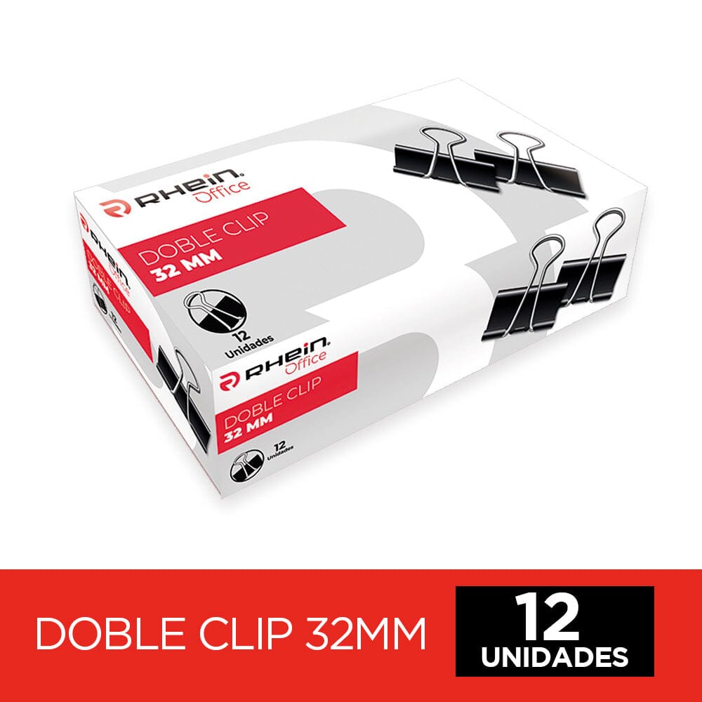 Clip Doble Negro Rhein. Fabricado en metal de alta calidad con un acabado negro elegante, este clip es ideal para sujetar múltiples hojas sin dañarlas, manteniendo siempre un aspecto profesional en el lugar de trabajo, el colegio o el hogar. Contiene 12 unidades.