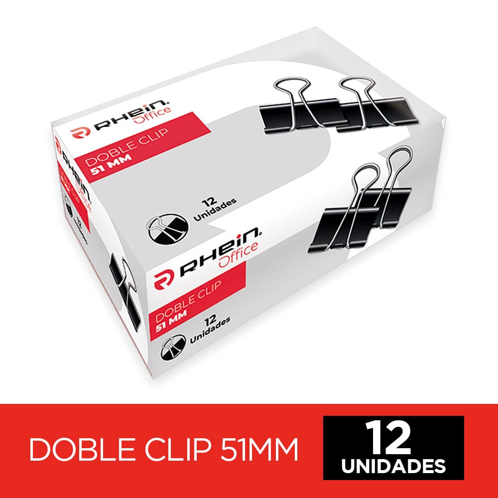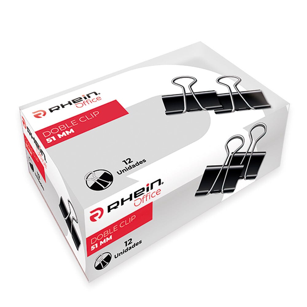 Clip Doble Negro Rhein. Fabricado en metal de alta calidad con un acabado negro elegante, este clip es ideal para sujetar múltiples hojas sin dañarlas, manteniendo siempre un aspecto profesional en el lugar de trabajo, el colegio o el hogar. Contiene 12 unidades.