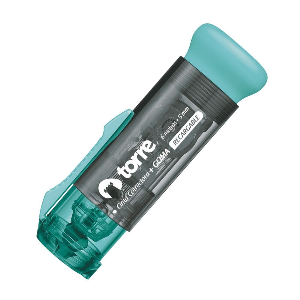 Para corregir en seco, el corrector en cinta retráctil con goma de borrar de la marca Torre es ideal, ya que permite escribir instantáneamente sobre la superficie utilizada. Muy manejable, práctica y además trae una goma de borrar en su extremo lo que permite borrar cualquier tipo de escritura sin la necesidad de cambiar de aparato. Tamaño de cinta 5 mm X 6 m.