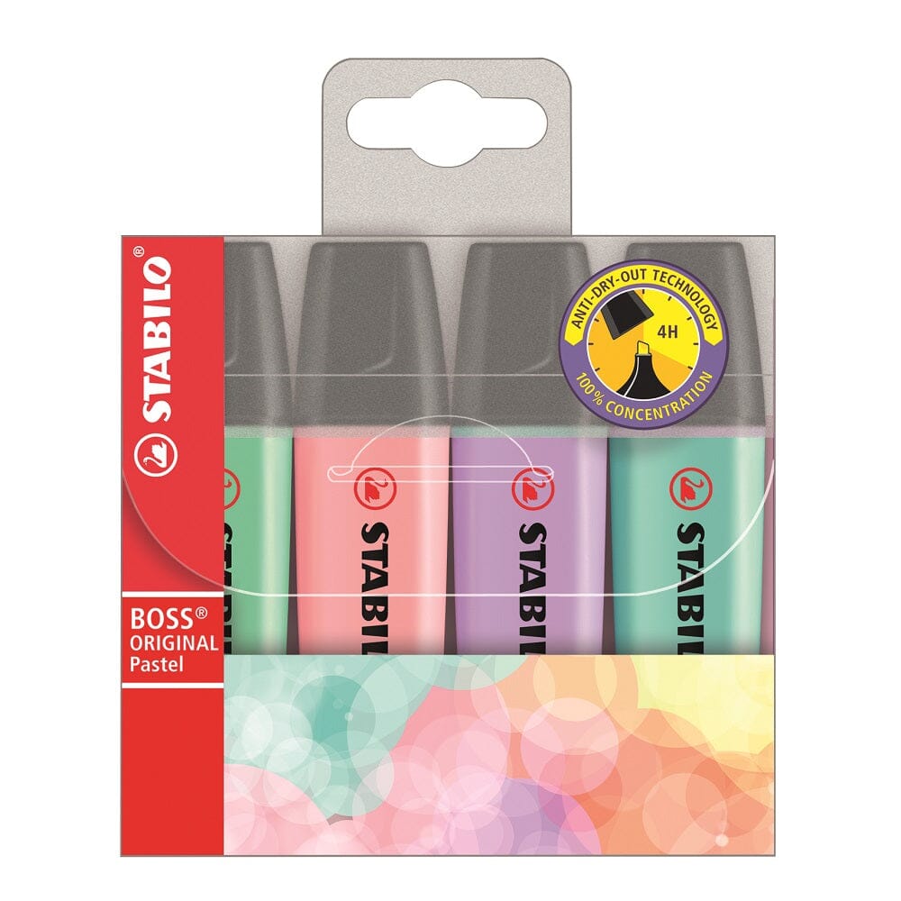 Pack de 4 destacadores Stabilo Pastel para que tengas tu equipo completo y nunca quedes sin destacar.