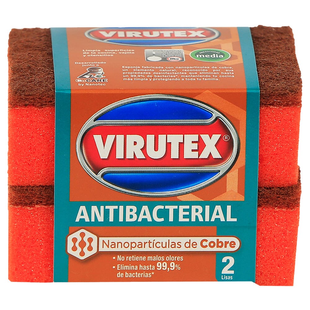 Virutex cuenta con una esponja lisa multiuso que eliminan hasta un 99,9% de gérmenes y bacterias de la esponja, gracias a sus nanopartículas de cobre. Que no falte en tus productos de limpieza esta esponja antibacterial, viene en su formato de dos unidades ¡utilízalas donde tu prefieras!