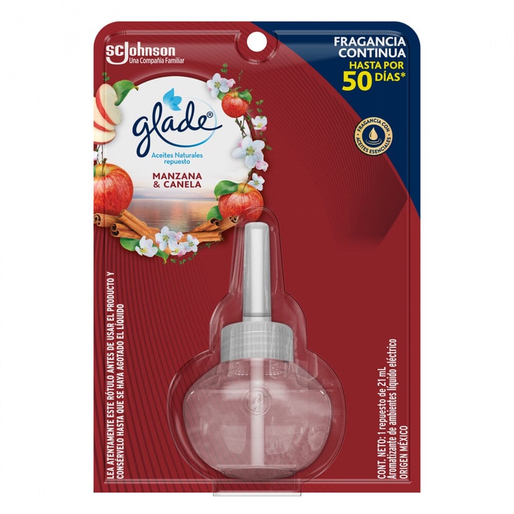Glade aroma a Manzana y canela te ofrece infusiones de extractos de aceites esenciales, con notas dulces y cálidas, amenizando y eliminando olores de inmediato.