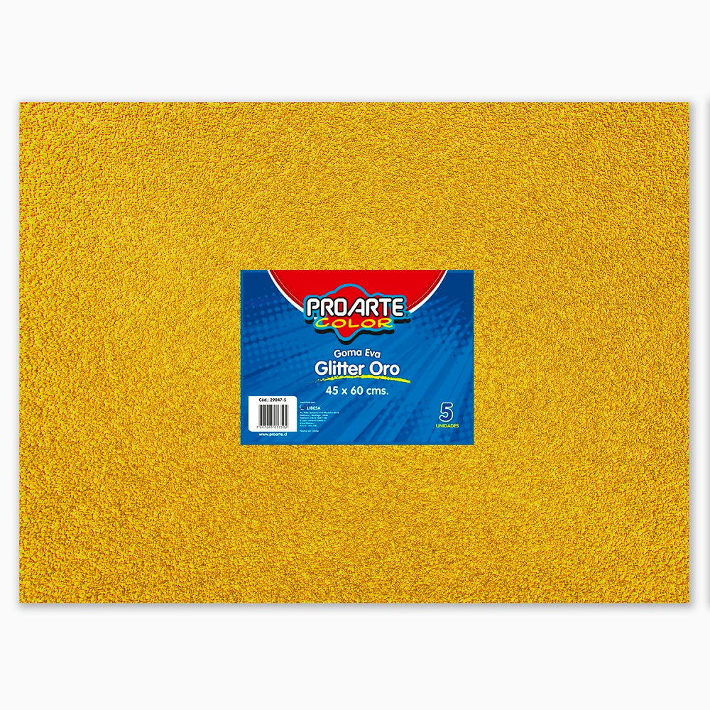 Para darle un toque a tus manualidades o deberes escolares utiliza goma eva glitter oro de la marca Proarte, es ideal para todo tipo de proyecto ya que tiene un bello tono y hermosos glitter.