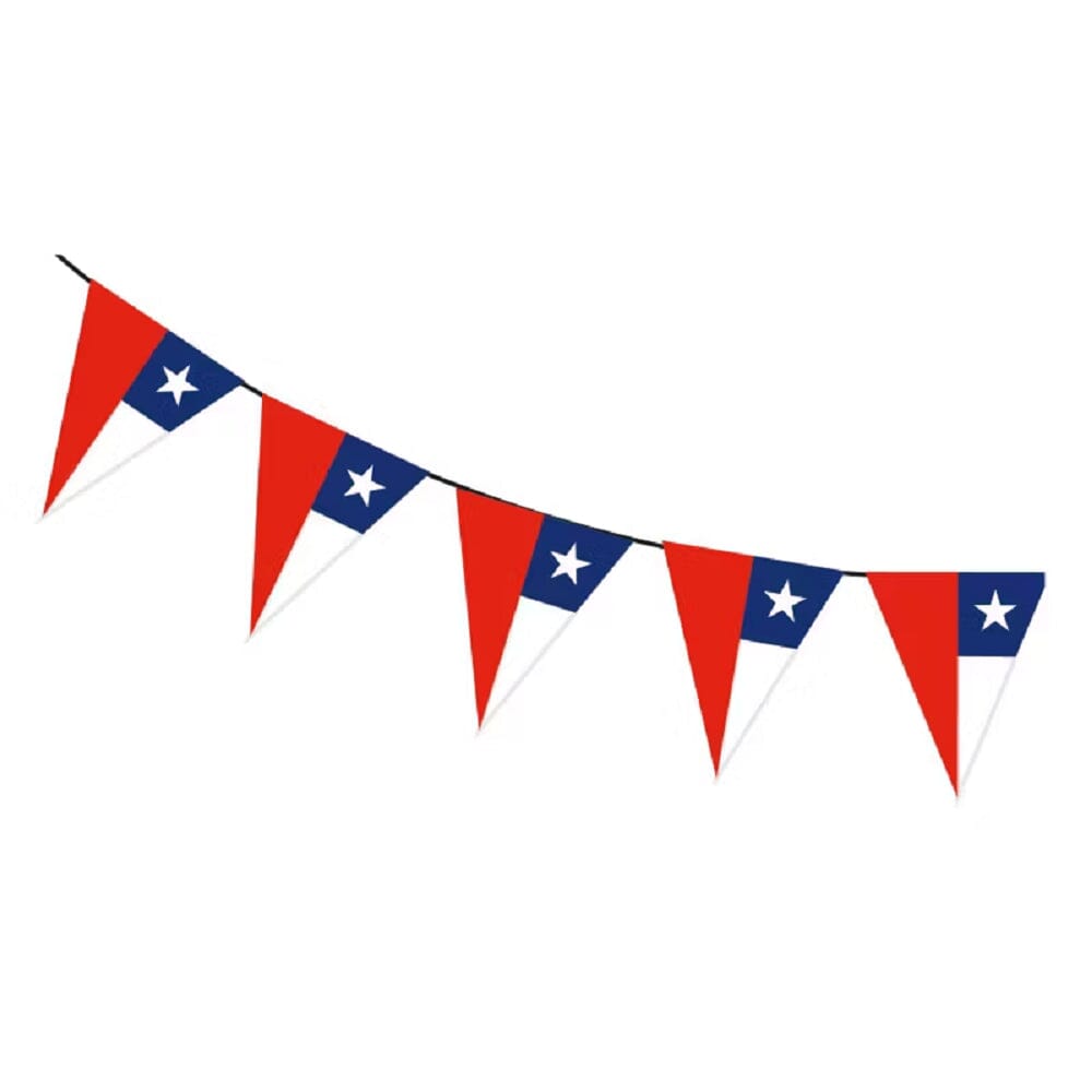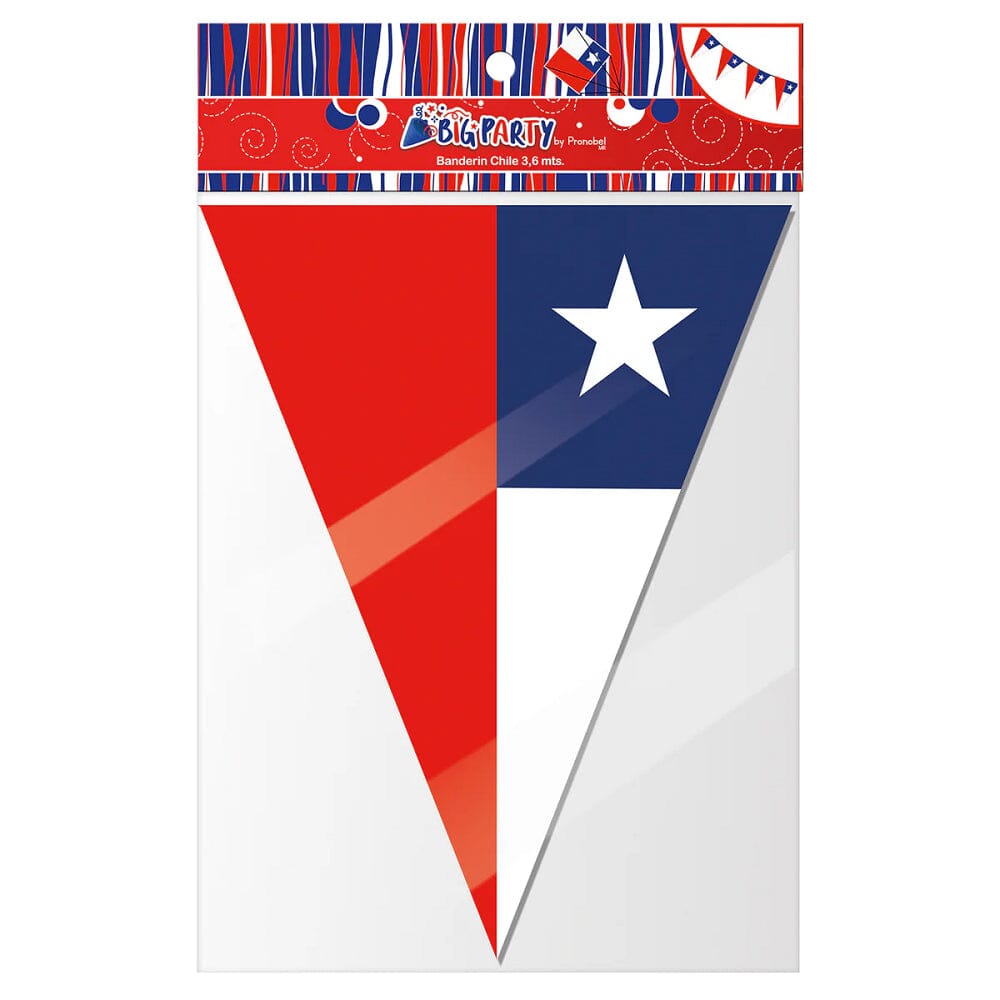 Celebra con orgullo las fiestas patrias con la guirnalda de banderines Chile de 3 metros de Big Party. Este adorno festivo, con los colores de la bandera chilena, es ideal para decorar interiores y exteriores.