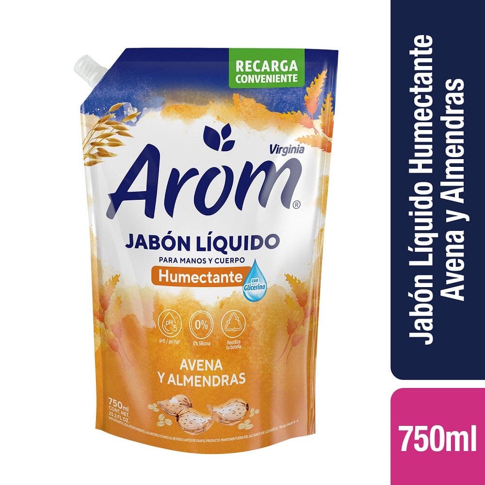 Arom Jabón Líquido Doypack Avena y almendra, para manos y cuerpo ayuda a proteger diariamente tus manos y las de tu familia, devolviendo la suavidad e hidratación de la piel. Gracias a las propiedades nutritivas ayuda a combatir la resequedad de la piel, evitando un aspecto áspero y escamoso, dejando un agradable aroma.