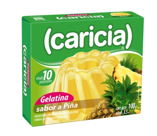 Polvo sabor piña para preparar postre de gelatina, caricia tiene para ti las jaleas más deliciosas y rendidoras que podrás encontrar.