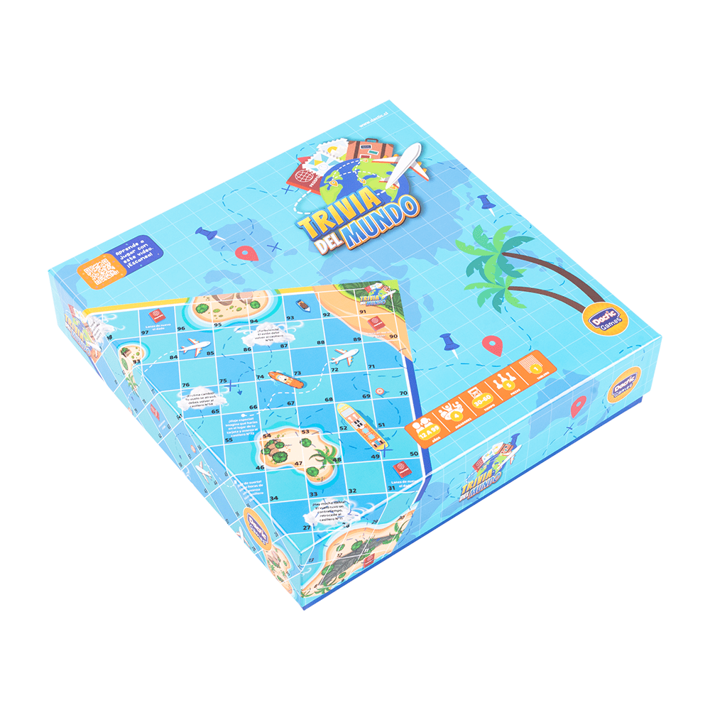 Contiene: 100 cartas, 1 dado, 4 peones, 1 tablero de 48 x 48 cm. aprox. e instructivo.