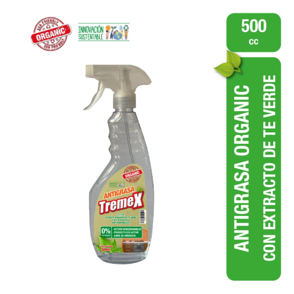 Limpiador anti grasa orgánico Tremex, está fabricado 100% a partir de ingredientes orgánicos como el té verde que posee propiedades antibacteriales, también cuenta con un envase que está compuesto de activos biodegradables y esta en su totalidad, libre de colorantes.