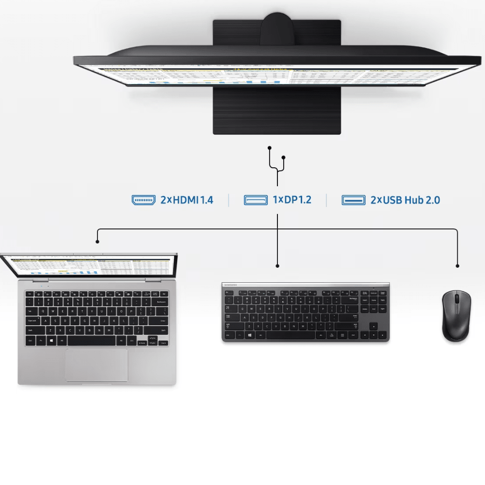 El monitor presenta un diseño elegante y moderno que se adapta a cualquier entorno. Los biseles delgados maximizan la pantalla, brindando una experiencia inmersiva.