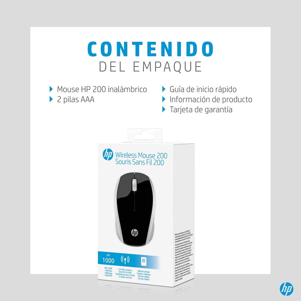 El mouse inalámbrico 200 2HU84AA#ABL de HP te ofrece más que un bajo precio. Te ofrece la libertad de crear sin cables que te sujeten. Tiene un diseño contorneado para usarlo con ambas manos, lo que aumenta tu productividad y reduce el esfuerzo. Nunca fue tan fácil y barato decirle adiós al cable. Contenido: Mouse inalámbrico HP 200. Adaptador inalámbrico de 2,4 GHz. 2 pilas AAA. Póster de inicio rápido. Avisos del producto. Tarjeta de garantía. Dimensiones del producto: 3,74” x 2,3” x 1,34”. 95 mm x 58,5 mm x 34 mm. Peso del producto: 0,17 lb. 0,078 kg. Compatible con: Windows 7 y posterior, Mac OS X 10.x y posterior y Chrome OS (2).