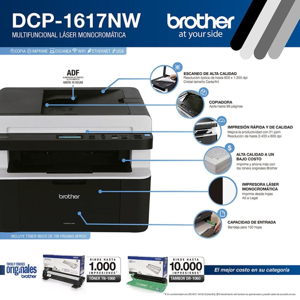 El Brother DCP-1617NW es un multifuncional láser monocromático que ofrece una variedad de características y especificaciones. Aquí hay un resumen de sus principales características: