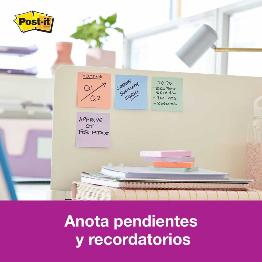 Las notas Post-it® súper adhesivas de papel 100% reciclado tienen el doble de poder de adherencia para garantizar que su mensaje permanezca en su lugar. El adhesivo a base de planta y agua se adhiere de forma confiable en distintas superficies para que puedas llevar tu lista de tareas pendientes a cualquier lugar.