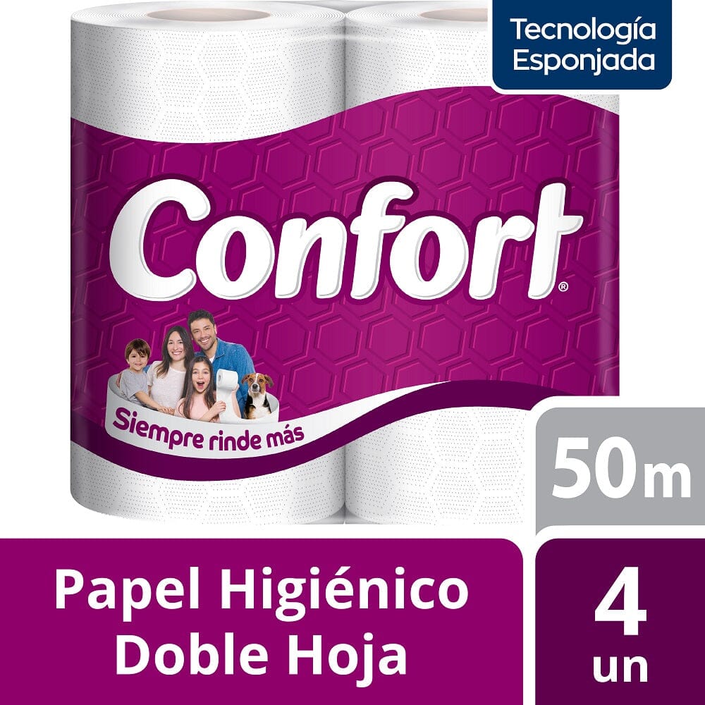 Disfruta de suavidad y rendimiento superior con el papel higiénico Confort doble hoja. Cada uno de sus 4 mega rollos de 50 metros ofrece mayor duración, ideal para el uso diario en el hogar o la oficina.