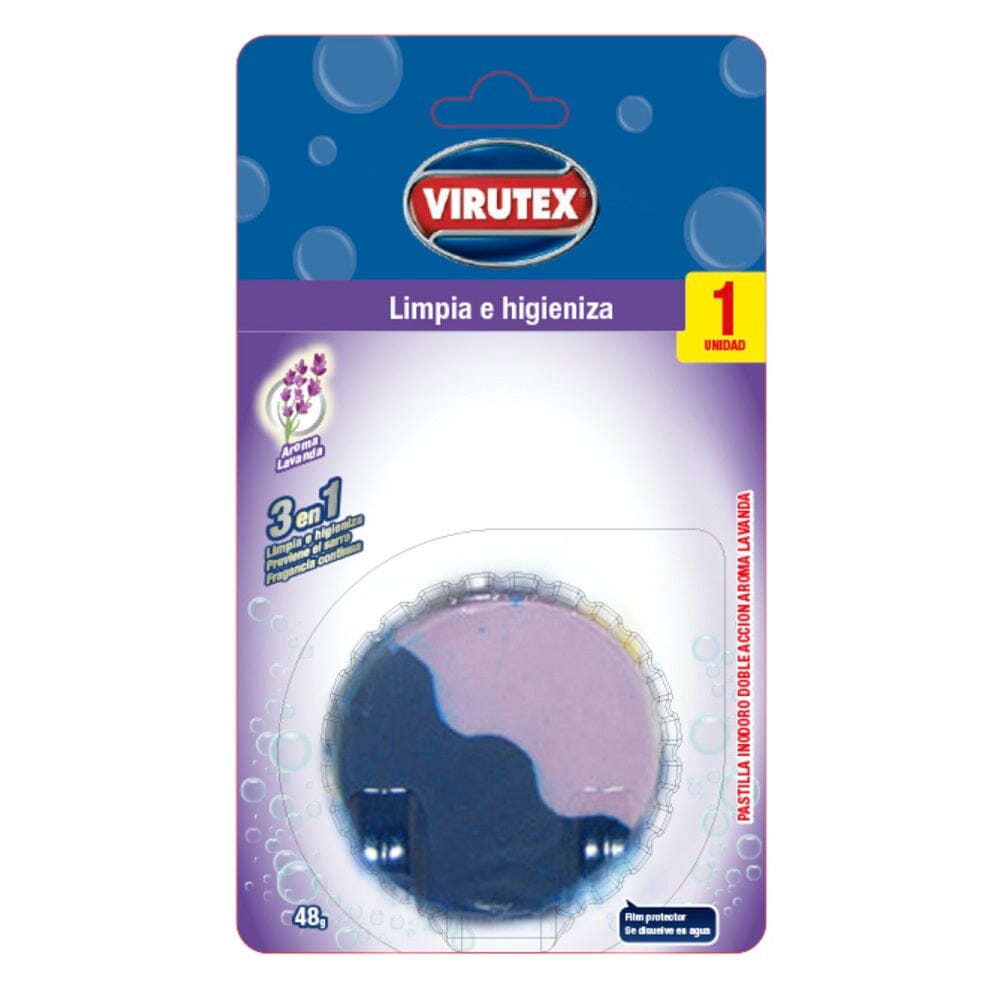 La pastilla inodoro estanque lavanda de Virutex, limpia e higieniza, previene el sarro. Además tiene una fragancia continua y no deja residuos.