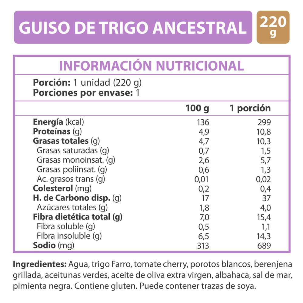 Agua, trigo Farro, tomate cherry, porotos blancos, berenjena grillada, aceitunas verdes, aceite de oliva extra virgen, albahaca, sal de mar, pimienta negra. Contiene gluten. Puede contener trazas de soya.