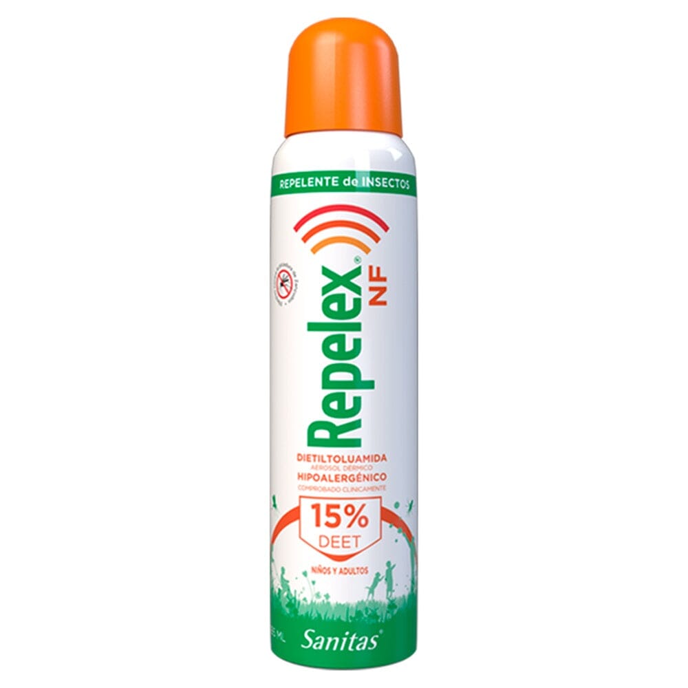 REPELEX NF Repelente de Insectos en Aerosol, brinda protección para toda la familia, contiene DEET al 15%. Previene picaduras de zancudos, mosquitos, moscas, jejenes, pulgas, garrapatas. Efectivo contra el mosquito Aedes Aegypty, causante del virus del Dengue, Zika y Chikungunya.