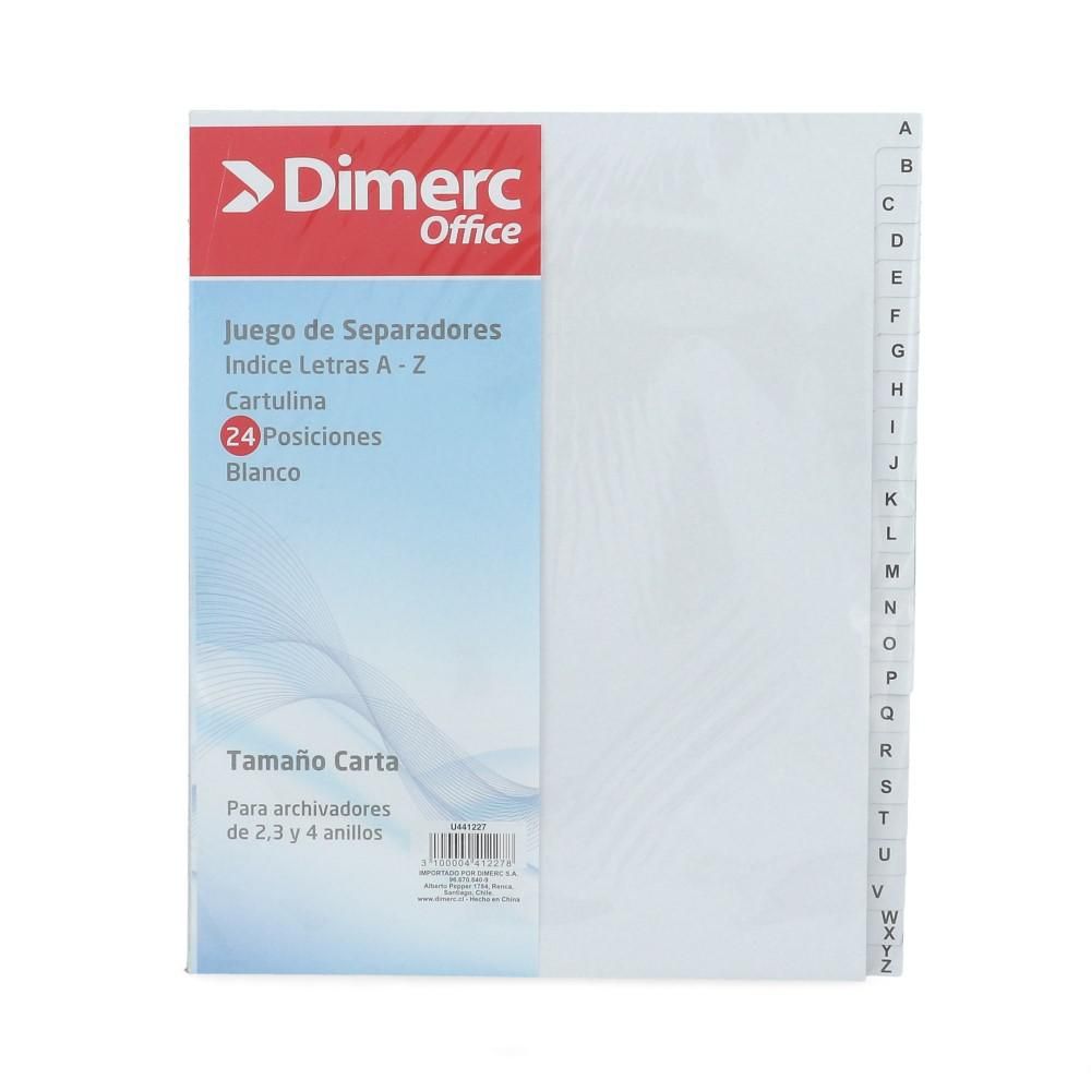 Juego de separadores Dimerc, una forma fácil y ordenada de guardar tus documentos. Índice de letras de la A a la Z, 24 posiciones. Para archivadores de 2, 3 y 4 anillos ¡Optimiza tu tiempo en la oficina!