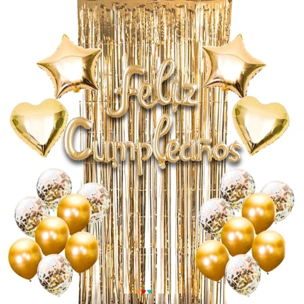 Celebra tu día especial con nuestro set de cortina y globos 'Feliz Cumpleaños' en tono dorado de Feco.