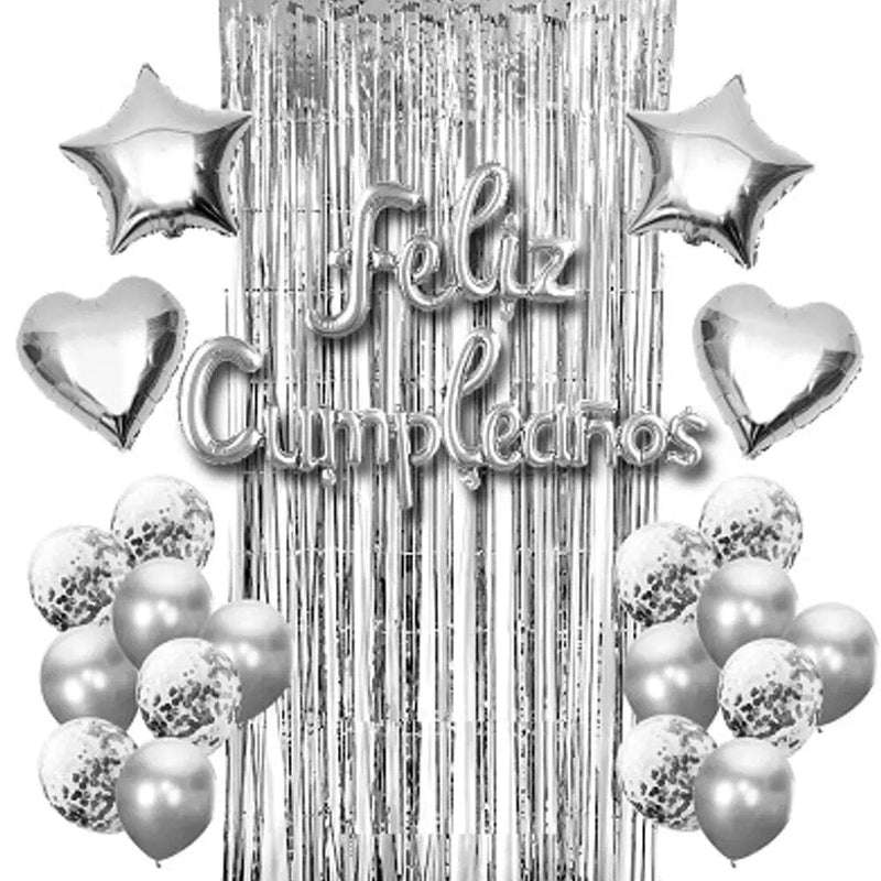 Celebra tu día especial con nuestro set de cortina y globos 'Feliz Cumpleaños' en tono plateado de Feco.