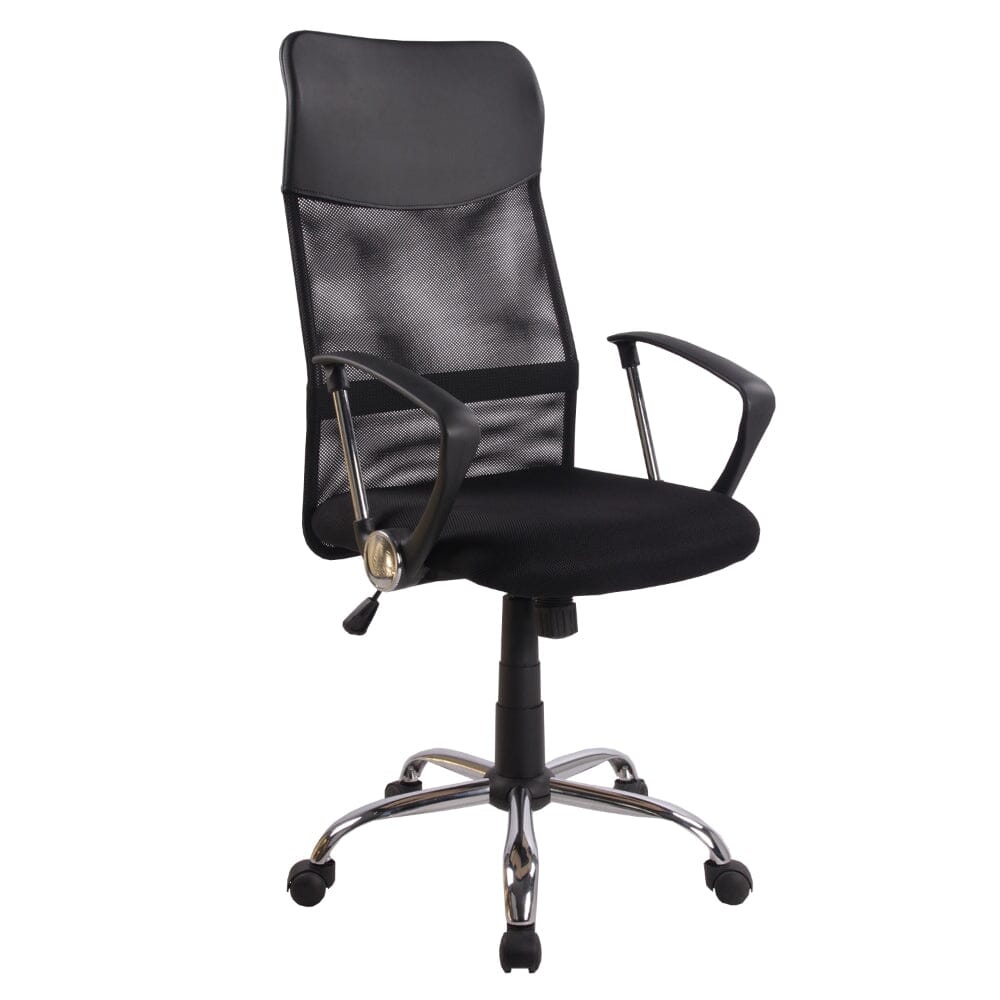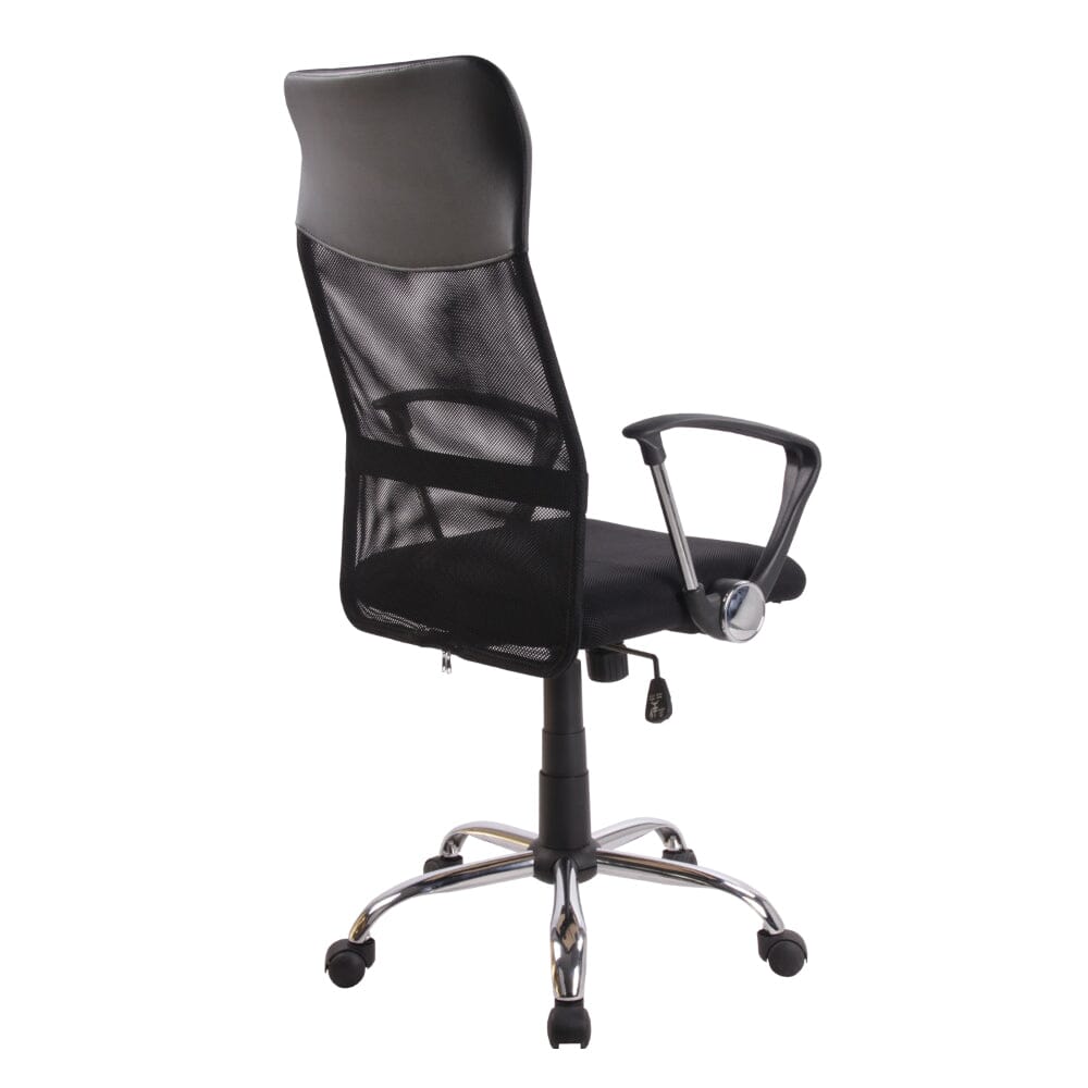 Silla de Escritorio Modelo Berny de color negro Negra. Silla de diseño moderno con respaldo alto en malla negra incluye tapizado PU en zona del apoyacabeza. Asiento de espuma tapizado en tela tipo malla negra. Brazos cromados con cubierta de polipropileno negro. Mecanismo reclinable con regulación manual de la tensión del respaldo. Regulación de altura y base cromada giratoria y 5 ruedas para facilitar el desplazamiento.