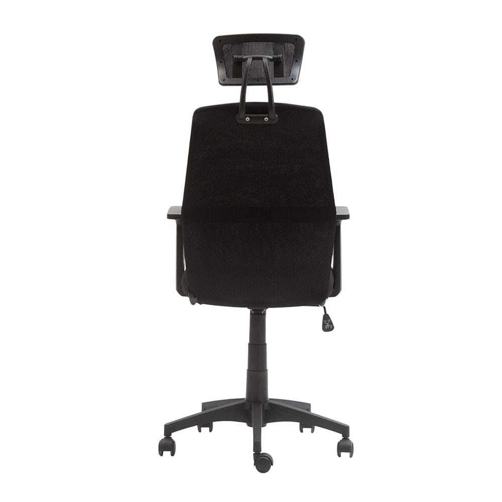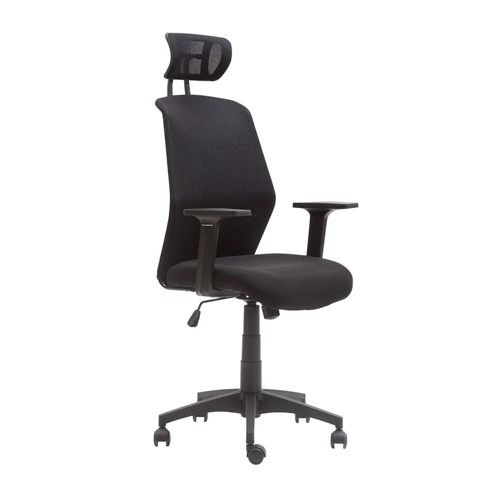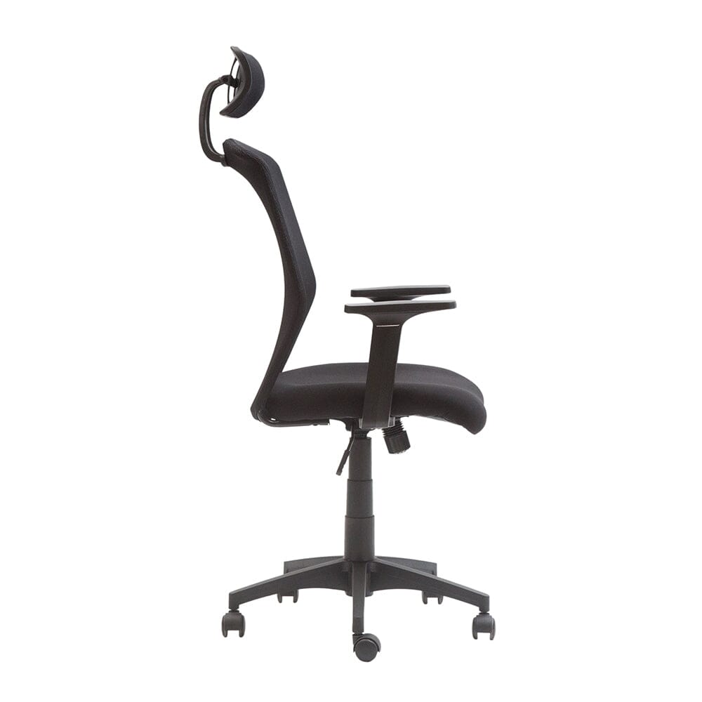 Silla de escritorio Thor de diseño moderno dinámico y confortable. Su respaldo alto en malla negra con cabecero y asiento de espuma tapizado negro hacen que Thor sea una silla perfecta para oficinas o Home Office ya que se adapta a distintos ambientes. Mecanismo reclinable regulación de altura del asiento brazos fijos de polipropileno y base nylon giratoria.