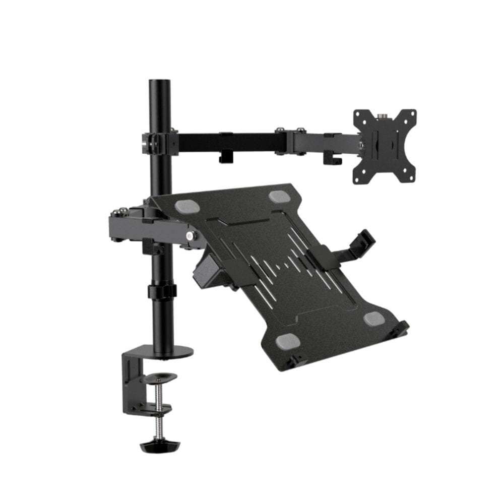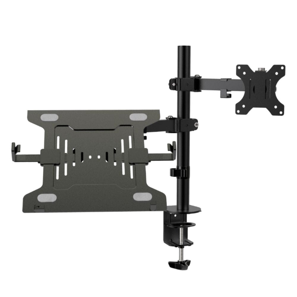 Este soporte para monitor y laptop es perfecto para monitores de 13 a 32 pulgadas y se puede instalar vertical u horizontalmente gracias a la placa con especificación VESA giratoria de 360 grados. Además, soporta una laptop de 10 a 15,6 pulgadas. Puede soportar un peso de hasta 8kg del monitor y 4.49kg de la laptop. También incluye un sistema de administración de cables que los organiza y los mantiene ordenados.