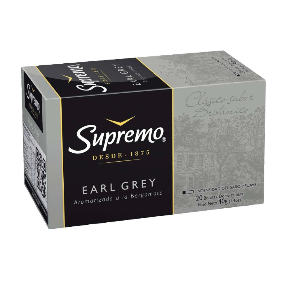 Un té muy refrescante, perfecto para disfrutar durante las tardes, es el té premium Earl grey 20 bolsas Supremo.Esta fina selección en té, es suavemente aromatizada con esencia natural de bergamota. Todo un clásico.