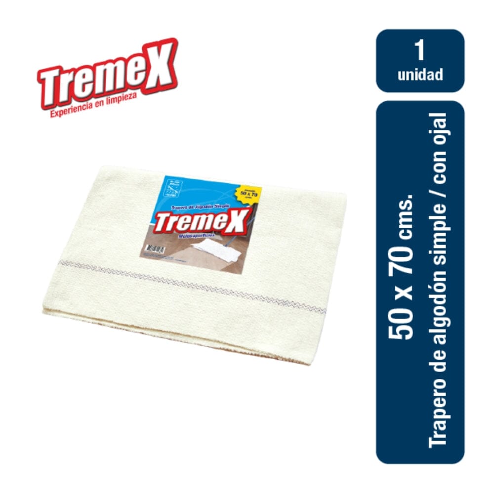 El trapero tremex de algodón tiene excelente poder de absorción y resistencia. Posee ojal reforzado para evitar desgarres. Por su tecnología no deja pelusas en la superficie.