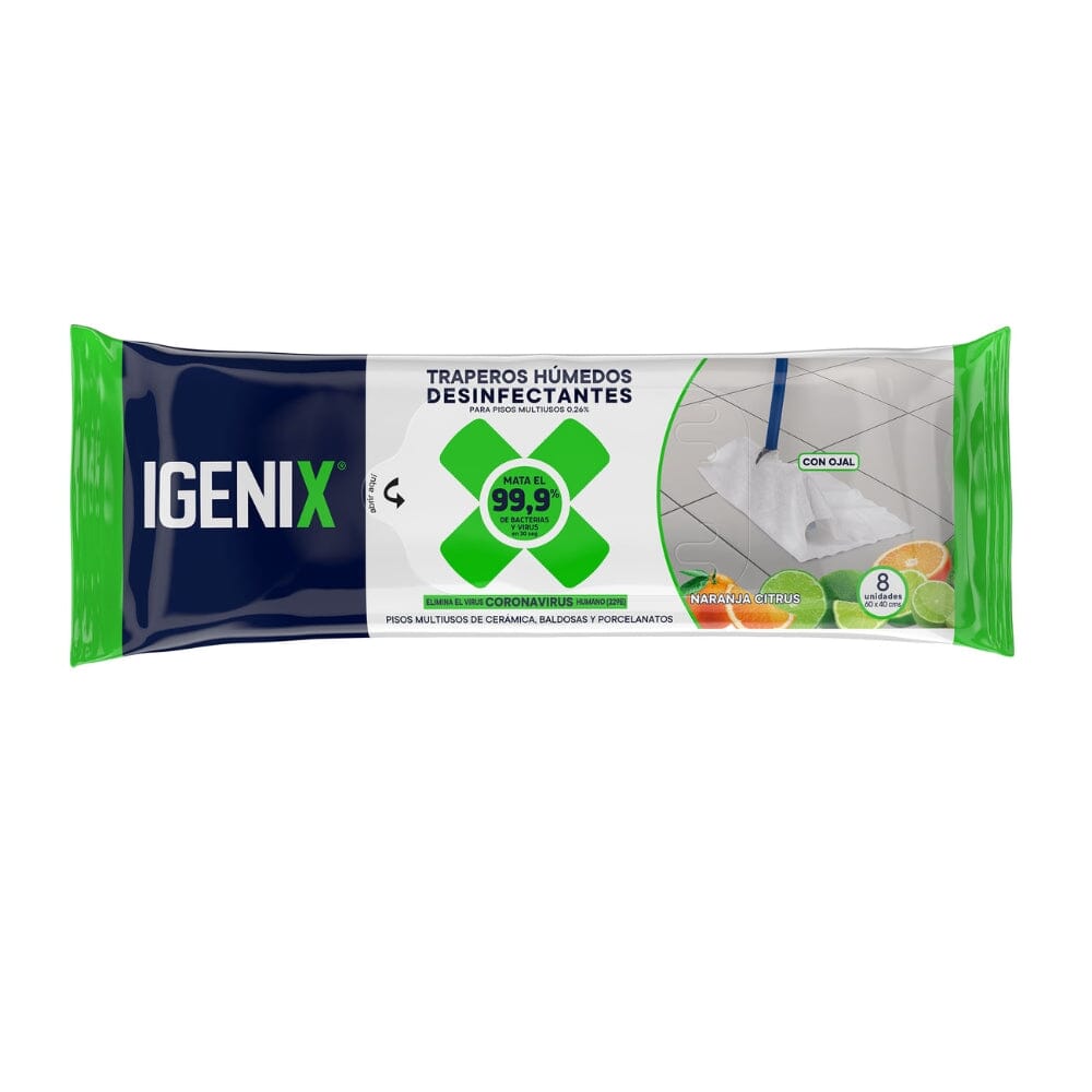 Igenix Traperos Húmedos Desinfectantes Multiuso Solución 0,26% limpian y desinfectan su hogar de forma rápida y efectiva. Recogen la suciedad y el polvo limpiando el piso y dejando un agradable aroma a Manzana Verde. Además, es desechable, siendo la forma más higiénica de limpieza que no acumula malos olores
