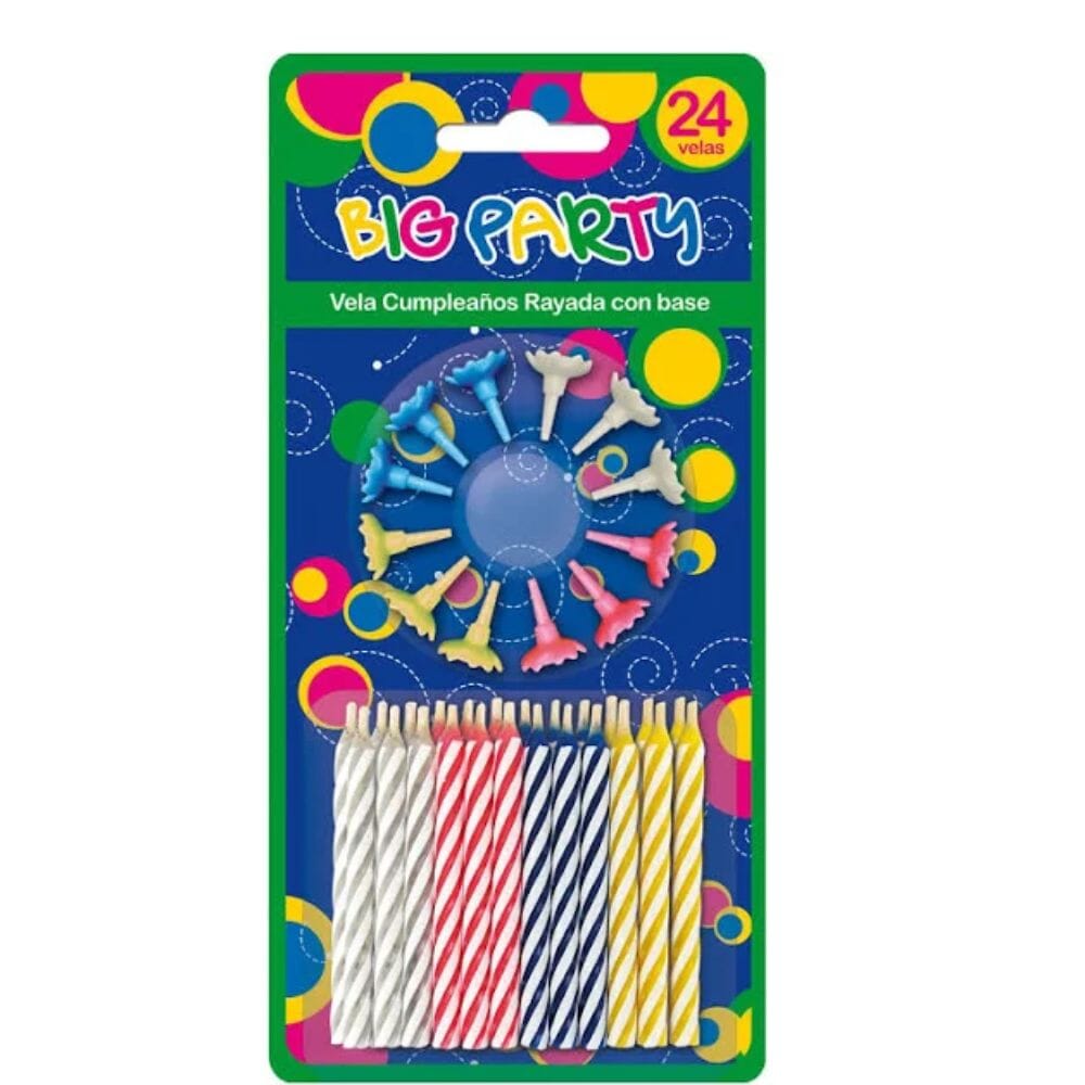 Dale un toque especial a tu pastel de cumpleaños con nuestro set de 24 velas con base rayada. ¡Haz tu pedido ahora y prepárate para iluminar la celebración con estilo y alegría!